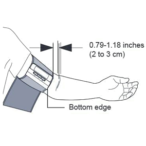 1. The cuff should be placed approximately 2 to 3 cm (about 1 to 1.2 inches) above the elbow. This ensures that the cuff is positioned at the heart level.